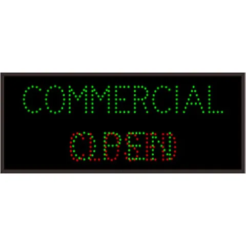This TCL Series COMMERCIAL | OPEN | CLOSED (120-277VAC) outdoor, blank-out sign is designed with super bright LEDs and a contrasting face; we guarantee it's readable in direct sunlight. The sign message is formed by visible LEDs on a black sign face and is designed to illuminate the message(s) when turned on and blank out or extinguish the message when off.