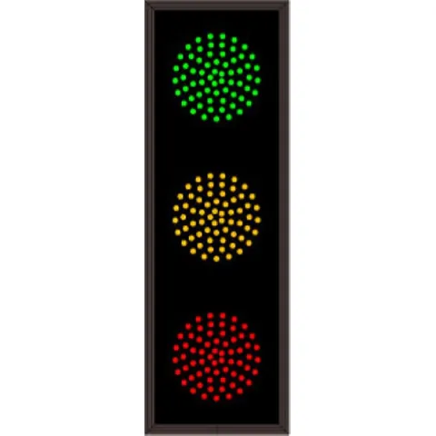 This TCL Series Indicator Dots, Triple, Vertical, 4 in dia, Green - Amber - Red outdoor, blank-out sign is designed with super bright LEDs and a contrasting face; we guarantee it's readable in direct sunlight. The sign message is formed by visible LEDs on a black sign face and is designed to illuminate the message(s) when turned on and blank out or extinguish the message when off.