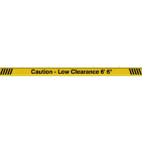 The IBAR-M Series clearance bar is a multi-piece, modular, 7" x 2.5" extruded aluminum system. Includes Easyglide Adjustable Eyebolts for top mounting for each modular section. Painted traffic yellow and displays your required message in factory-applied, high-performance reflective vinyl (Black reflective vinyl is standard). Custom paint colors and graphics are available upon request.
