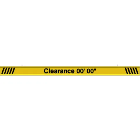 The IBAR-C Series clearance bar is a single-piece, 7" x 2.5" extruded aluminum system. Includes Easyglide Adjustable Eyebolts for top mounting. Painted traffic yellow and displays your required message in factory-applied, high-performance reflective vinyl (Black reflective vinyl is standard). Custom paint colors and graphics are available upon request.