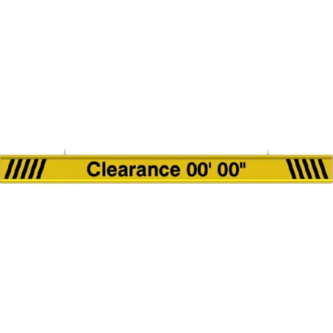The IBAR-C Series clearance bar is a single-piece, 7" x 2.5" extruded aluminum system. Includes Easyglide Adjustable Eyebolts for top mounting. Painted traffic yellow and displays your required message in factory-applied, high-performance reflective vinyl (Black reflective vinyl is standard). Custom paint colors and graphics are available upon request.