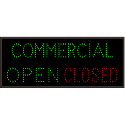 This TCL Series COMMERCIAL | OPEN | CLOSED outdoor, blank-out sign is designed with super bright LEDs and a contrasting face; we guarantee it's readable in direct sunlight. The sign message is formed by visible LEDs on a black sign face and is designed to illuminate the message(s) when turned on and blank out or extinguish the message when off.