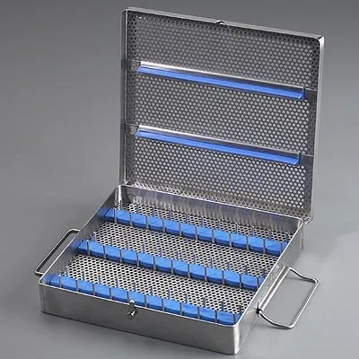 Sklar's® Sterilizing Trays are used to hold instruments securely during a sterilization process. This product has rows of separating pins and silicone hold down bars for locking instruments in place. The tray also has a hinged lid, locking latch and outside handles.