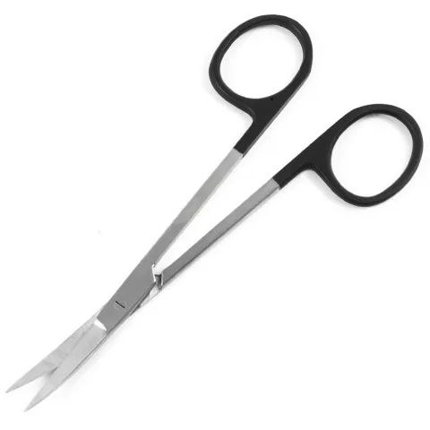 Sklarhone™ Iris scissors feature one knife-like razor sharp edge and one standard scissor edge. This allows the user to make the sharp incisions of a knife with the cutting ability of scissors. Catching skin and pulls are minimized by the use of Sklarhone™ premium scissors. Originally designed for ophthalmic procedures, Iris Scissors have become a multipurpose instrument used in various surgical environments. These fine, sharp scissors are ideal for detailed dissection of fine tissue and fine suture removal. In addition to ophthalmic procedures, Iris Scissors are now often used in emergency rooms and for OB/GYN and dermatologic procedures. Sklarhone™ instruments are identified by dual black finger rings. This product is curved with one razor edge blade, sharp tips, and an overall length of 4-1/2 inches.