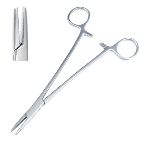 Sklar's® Brown Needle Holder is a ratcheted, finger ring instrument used for holding needles. It is commonly used in plastic surgery and other procedures where suturing superficial tissue is necessary. This product is straight with rounded, serrated tips and a length of 6-3/4inches.