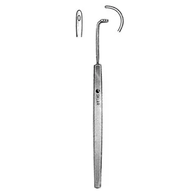 Sklar's® Kronecker ligature needle is used for guiding suture material into difficult to reach areas or deep muscle and tissue.Sharp enough for tough tissue while not damaging the surrounding area. The Kronecker is availale with a right or left curve.