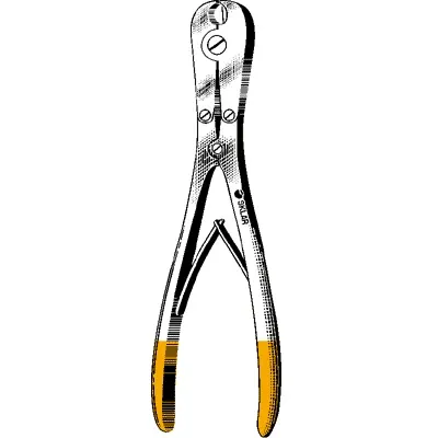 Sklar's® TC pin cutter is an orthopedic instrument used to cut wire and pins that are implanted during surgical procedures. They come in side cutting end cutting versions, as well as two different lengths. TC instruments are designed to stay sharp for a significantly longer period of time than other standard instruments. Sklar permanently bonds tungsten carbide inserts to the instrument, which maximizes control and precision. TC instruments are identified by gold handles.