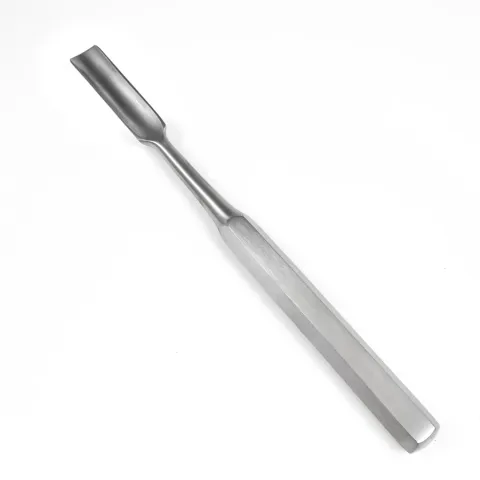 Sklar's® Hibbs Gouge is essentially a Hibbs chisel with partially cyllandrical blades that resemble a small trough. Similar to chisels and osteotomes, the Hibbs gouge is used for scraping, cutting, or shaping bone. It is particularly useful for contouring and is most commonly used in orthopedic procedures. This instrument is straight with an overall length of 9-1/2 inches, and a 25mm wide blade.