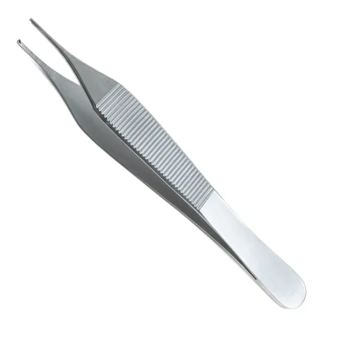 Sklar® Adson Tissue Forceps are for holding and manipulating delicate tissues. These forceps have a wide, flat thumb grasp area that is commonly serrated. The jaws are short and the tips are narrow. This product is straight with cross-serrated jaws, 1x2 teeth, and a length of 4-3/4 inches.