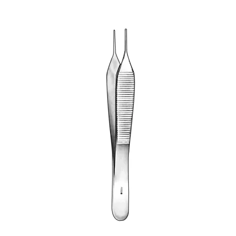 Sklar® Adson Tissue Forceps are for holding and manipulating delicate tissues. These forceps have a wide, flat thumb grasp area that is commonly serrated. The jaws are short and the tips are narrow. This product is straight with serrated jaws, 1x2 teeth, and a length of 7 inches.