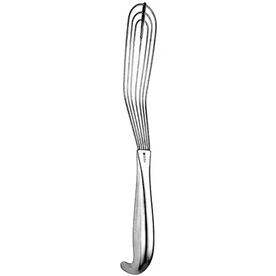 The Sklar® Allison Retractor is a handheld, non-ratcheted retractor used for holding lung tissue. It has a solid handle with a finger rest at the bottom and a flattened wire spatula shaped working surface. The wires are flexible and extend downward slightly away from the handle before slightly curving upwards again. The instrument resembles a flattened kitchen whisk. This product is straight with a 65mm retracting surface, and a length of 12-3/4 inches.