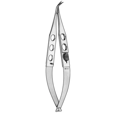 Sklar's® Troutman-Katzin Corneal Transplant Scissors are primarily used for cutting corneal tissue in Keratoplasty procedures. They are very similar to Katzin Corneal Transplant Scissors but feature an additional locking mechanism on the handle that is able to keep the lower blade from moving. Like the Katzin scissors, the blades are different lengths, and available curved right or curved left to maximize the precisin of cutting. The double spring handle is also fenestrated. This product has small blades, strongly curved to the right. It also features a stop to avoid damage to both the tissue and the instrument due to excessive pressure while cutting. The overall length is 4 inches.