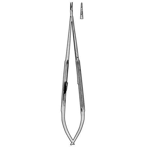 Sklar's® titanium Castroviejo needle holder is used suturing during micro surgery - including ophthalmic and cardiothoracic. It has a diamond-like coated jaw of fine tungsten carbide dust to ensure a firm grip on the needle. The instrument is available in two tip sizes for different sutures. The handle is round with or without ratchet. The product is available in three different lengths, curved or straight.