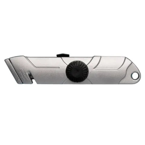 All Metal, Heavy Duty, Safety Spring-Back Blade Utility Knife. Perfect for any cutting application, this heavy duty utility knife offers safety, durability, and ease in one cutter. Our quick blade change knob means no tools are required for blade changes and blade notch allows for the cutting of stretch wrap or twine without extending the blade. Uses Tach-It Style B-3 Blade.