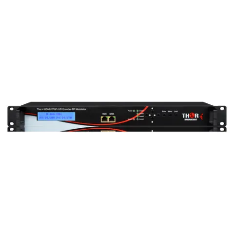 Designed as a companion encoder for the popular QAM-IP series of encoder modulators, Thor H-4HD-EMH series HD program encoders accept up to 4 channels of uncompressed HDMI digital video on 4 inputs; or component and composite video inputs for mixed media, also accepts composite baseband alongside HDMI to produce Closed Captions on your HDMI programs. Managed through any modern web browser, each encoder can be independently adjusted for bitrate, codecs, and video image qualities. Encoding support for the MPEG-2 codec along with Dolby AC/3 audio ensure that the programs generated on this encoder can be viewed by virtually every TV in the United States. All four program streams are multiplexed into an ASI MPTS output on mirrored BNC terminals. The ASI output can be directly connected to the ASI input on a QAM-IP digital TV channel modulator. This allows additional programs to be added to the QAM-IP output channels as additional "virtual" or "sub" channels. On a TV this will appear as channels 2.1, 2.2, etc. Each digital channel can carry as many as 20 programs, depending on resolution and encoded bit rate. In addition to the ASI output, the program streams are also available as UDP or RTP network video transport streams. This output is fully compliant with IGMP Multicast UDP MPEG-TS standards and can be easily injected into almost any IPTV system. The stream is a universally accepted format, and can easily be viewed in client applications such as VLC. In addition to network management on a dedicated NMS Ethernet port, all settings and menu configuration items can easily be viewed or adjusted from the front panel LCD and keypad. LEDs are also provided for alarm monitoring and input video detection.