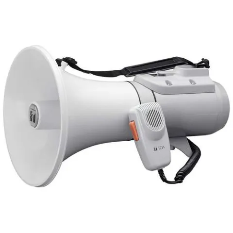 - Compact megaphone with shoulder strap and instant-on amplifier
