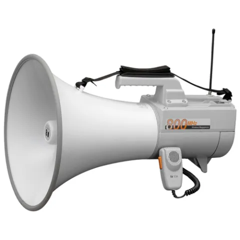 The ER-2930W is a 30 W shoulder-type megaphone equipped with a built-in whistle. It is designed to accommodate an optional wireless tuner module, enabling remote announcements via a wireless microphone when the module is installed. It can also be mounted on the optional ST-16A speaker stand.