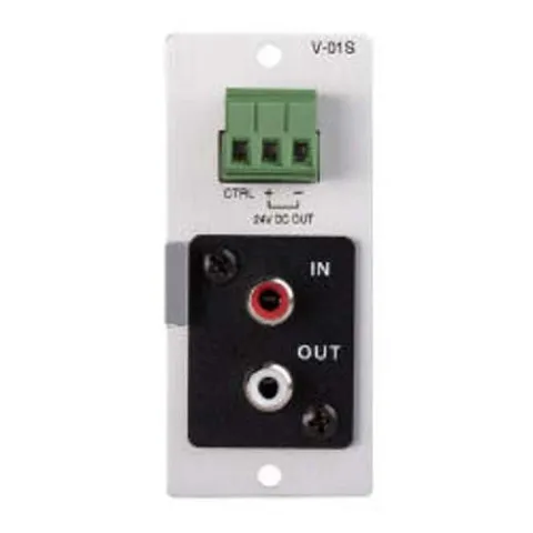 The V-01S is a plug-in type VCA module designed to be used in conjunction with TOA's 900 Series and BG-2000 Series amplifiers. Its 3P terminal block is equipped with a 24 V output that supplies power to an external controller, and a control input. The gain between IN and OUT is set within the range of -100 to 0 dB referenced to the 0 - 10 V control voltage.