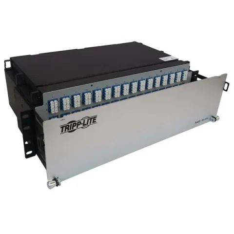 All necessary cabling is included with this preloaded fiber panel, coiled inside and ready for immediate use. The aluminum 3U chassis features 48 MTP/MPO-APC to LC Duplex 8-fiber singlemode trunk cables, all five meters (16.4 feet) in length to make management easy. The panel opens to provide easy access to stored cables. Use only as much cabling as you need. The remainder stores inside the chassis to eliminate cable clutter, allow better airflow through the rack and make equipment maintenance and replacement easier. The cables and panels have labels to help with organization. You also avoid the expense and effort of custom cabling. The flexibility in cable length lets you reuse the cables if equipment is moved.