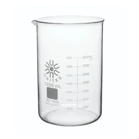 Beakers feature heavy and uniform wall thickness, spouts designed for easy pouring, and beaded tops. The 20ml and larger sizes also have a double graduated metric scale and a marking area.