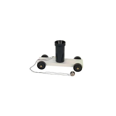Push the cart and eject the steel ball from the spring-loaded barrel. The ball falls back into the barrel of the moving car, demonstrating that the forward motion of the ball is the same as the vehicle from which it was ejected. Comes with a steel ball, release pin, and cord. The barrel permits two different heights of ball flight. Includes activity guide.