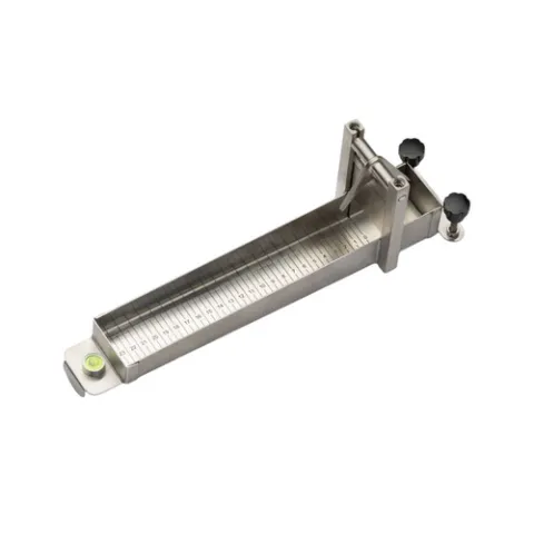 The consistometer is made of polished stainless steel construction with easy to read 0.5 cm increments. The spring-loaded gate holds about 75 mL of sample. Two leveling screws adjust the angle, and a spirit level helps with precision.