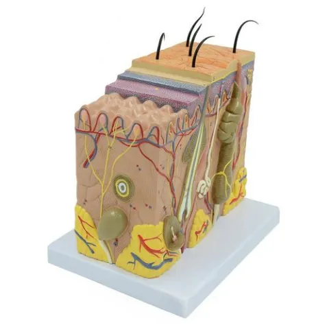 This cross-sectional view of the human skin, enlarged 70 times, gives a close-up and 3-dimensional view. It shows three layers and a detailed view of the sweat gland, fatty tissue, and hair follicle. A color key is included identifying 17 parts of the skin. Model is made from PVC plastic. Includes detailed key card.
