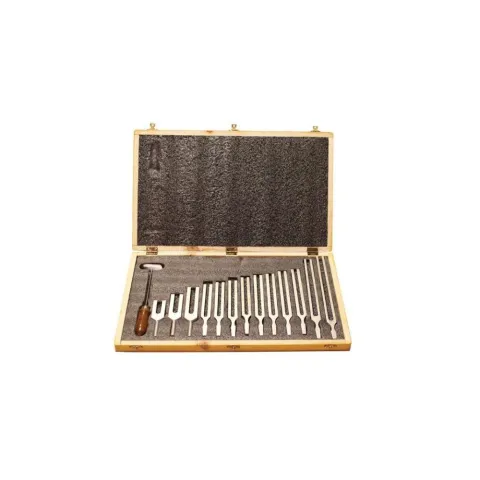 Tuning Fork Boxed Set of 13 includes a wooden box with foam lining. Each aluminum alloy tuning fork has a specific die-cut place in the foam lining for easy storage. Also contains a mallet specially designed with one hard and one soft end for use with all frequencies of forks. Contains one each of tuning forks with frequencies of 100, 128, 256, 288, 320, 341.3, 384, 426.6, 480, 512, 1024, 2048, and 4096 Hz.