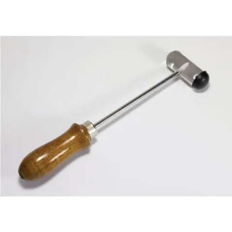 Tuning fork mallet has a head with one end made of hard acrylic and the other end made of rubber. Head is mounted on a metal rod with an easygrip wooden handle.
