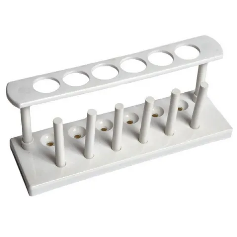 This polyethylene rack will hold six test tubes, and has six drying pins. Sides are fully open for clear viewing. Rack has six 25mm holes.