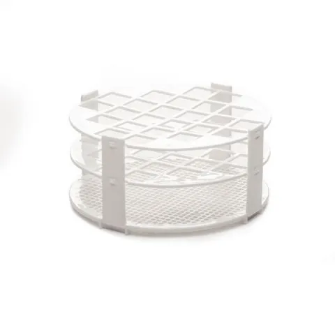 Good quality round test tube rack will hold 24 tubes up to 20mm in diameter. Solid high-impact plastic construction. Rack is 145mm in diameter and 70mm high, and features a perforated bottom. Shipped pre-assembled.