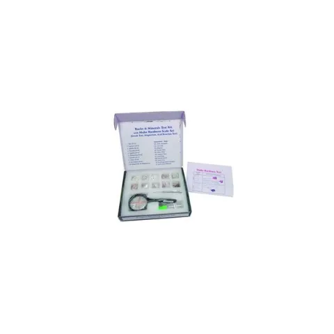 Accessory tools: knife, iron nail, magnet, streak plate, glass plate, copper plate, iron plate, garnet board, hand lens, acid drop bottle (empty), instruction manual.