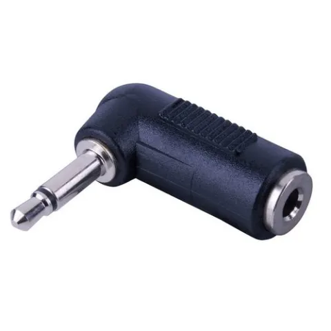 Right Angle 3.5 mm Mono Plug - 3.5 mm Stereo Jack Adapter, Nickel Finish, Black Molded Plastic, High Quality, Package