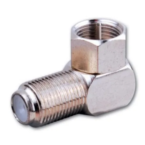 Right Angle Female "F" Jack to Male "F" Plug Adapter, Nickel Plating, Low-Profile Coax Solution, Space-Saving, Package