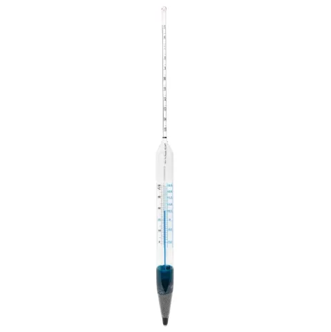 VEE GEE Scientific Brix Scale Hydrometers with °C Thermometer are calibrated to accurately measure the percentage of sucrose by weight at 20°C. These hydrometers use the Brix scale, where 1°Brix equals 1% sucrose by weight at a specified temperature. The integrated thermometer is located in the body and measures temperatures from 0 to 50°C with 1° subdivisions. A correction scale is printed opposite the thermometer for easy conversion of readings to 20°C. The safety blue liquid fill provides clear, visible temperature readings.