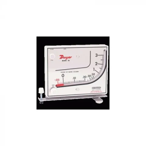 Series Mark II molded manometers are of the inclined and inclined-vertical types. The curved inclined vertical tube of the model 25 provides higher ranges with more easily read increments at low readings. The model 25 is excellent for general purpose work. Dwyer Mark II manometer - the industry standard for crossdraft spray booths. This gauge takes the guesswork out of when to change your spray booth filters. OSHA required for paint spray booths. Capable of pressure measurements above and below atmospheric as well as differential pressure measurements. Included with each Mark II manometer are two tubing connectors for 1/8 in pipe or sheet metal ducts, two mounting screws, 1 oz bottle of indicating fluid, red and green pointer flags and complete instructions.
